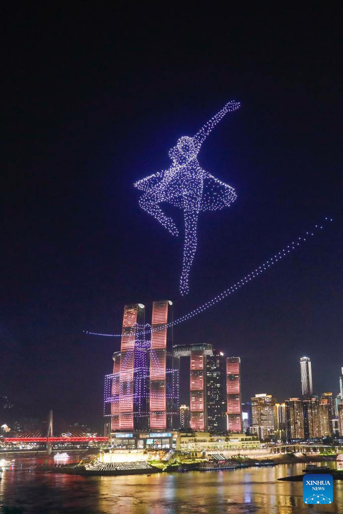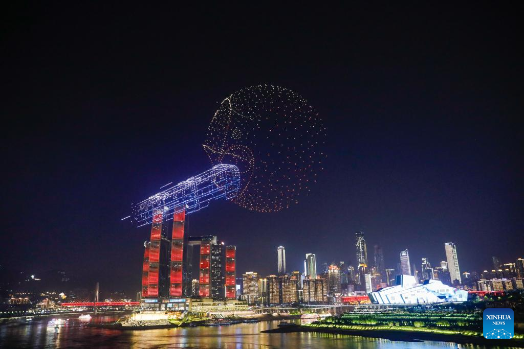 CHONGQING, 20 abril, 2025 (Xinhua) — Imagen del 19 de abril de 2025 de un espectáculo de luces con drones visto, en el distrito de Nan’an, en la municipalidad de Chongqing, en el suroeste de China. El espectáculo de luces con drones de 15 minutos de duración, que muestra lugares emblemáticos de la municipalidad de Chongqing, hizo su debut el sábado, presentando una fiesta visual junto con una exhibición de iluminación de la municipalidad. El espectáculo se celebrará de forma regular todos los sábados en la municipalidad y también los días festivos y algunas otras ocasiones importantes. (Xinhua/Huang Wei)
